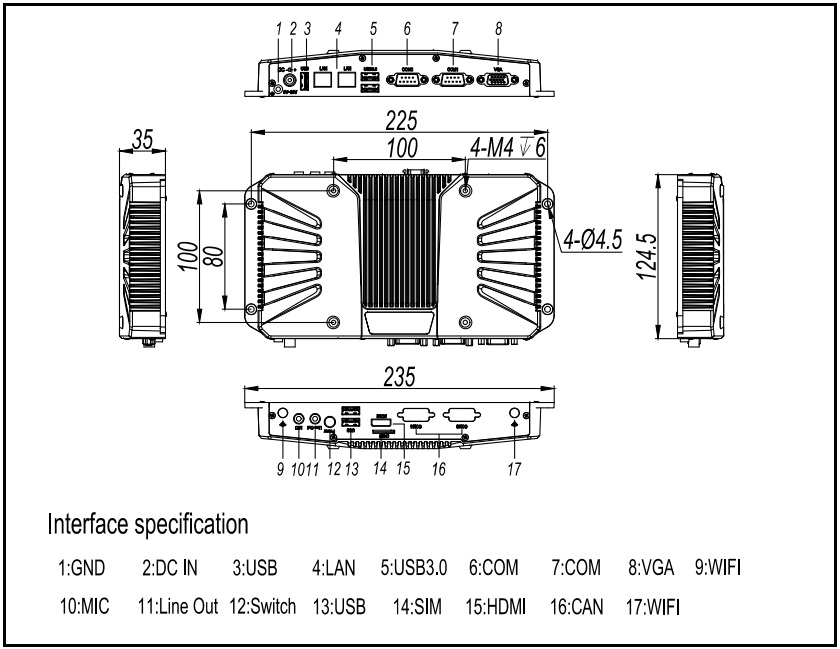2個Intel網口,芯片:I211(支持巨型幀) 2個COM(支持RS485光電隔離) 3個USB3.0, 2個USB2.0 2路隔離CAN通道(符合CAN總線規范2.0A/2.0B) 可選 1個VGA,1個HDMI 1個LINE, 1個MIC1個SIM(支持3G/4G全網通),2個ANT(Wifi/4G模塊天線孔) |