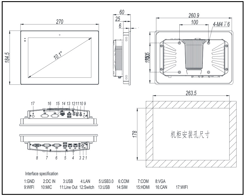 2個INTEL網口,芯片: I211(支持巨型幀) 2個COM(RS232/485可調,支持RS485光電隔離) 3個USB3.0,2個USB2.0 2個隔離CAN總線接口(可選) 1個VGA,1個HDMI 1個Line-out,1個MIC 1個SIM(支持3G/4G全網通),2個ANT(Wifi/4G模塊天線孔) |