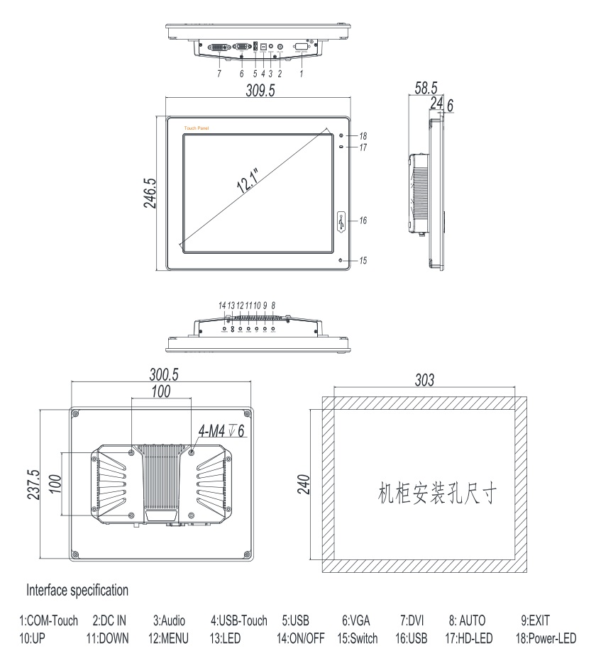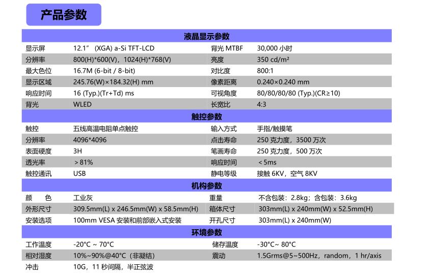 TD-121M工業顯示器采用模塊化設計思路,整機流線形箱體設計和人性化外觀設計,集成了超高亮度液晶屏和電容觸摸屏,具有更好的靈敏度、透光性和較長的使用壽命,同時具有不怕灰塵、油污和電磁干擾等優點。堅固美觀的全模具壓鑄成型面板,配合高溫五線電阻觸摸屏,高亮寬溫LED背光液晶屏,符合IP65防護等級。支持桌面式安裝,適用于MES、環保、電力、石油化工等多種通訊要求的應用場合。