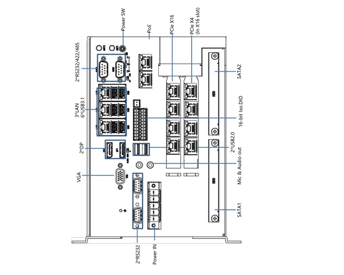 3~13個INTEL網(wǎng)口:i210-AT@ I219-LM 4個COM(支持 RS485/RS422/RS232) 6個USB3.1,2個USB2.0 1個VGA,2個DP,1個LINE-OUT , 1個MIC 16路隔離GPIO(2.5KV光隔離)